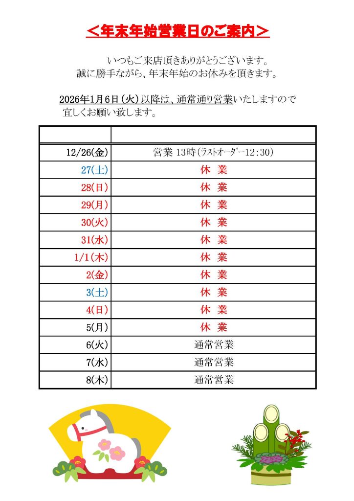 ※12/26(金)は13時(L.O: 12:30)までとなります。